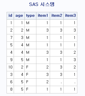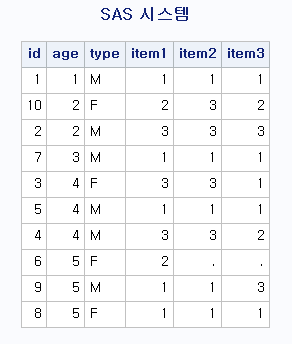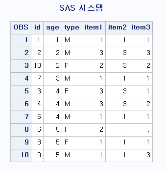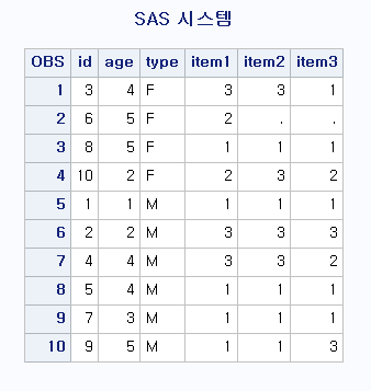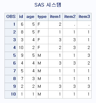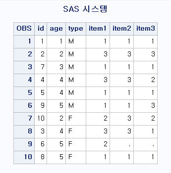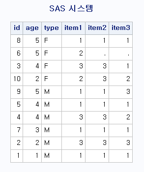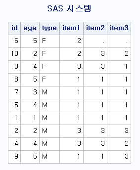 PROC SORT DATA=ss.company OUT=acompany ; BY age ; RUN ; PROC PRINT ; RUN ; /*결과 출력하기*/