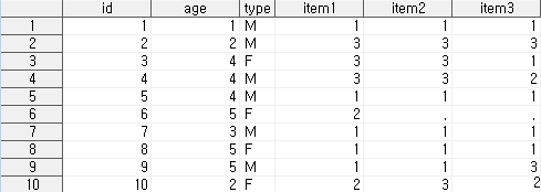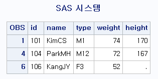 DATA customer ; INPUT id $ 1-3 name $ 5-10 type $ 13-17 weight 18-19 height 21-23; CARDS; 101 KimCS M1 74 170 102 LeeYH F1 68 166 103 AhnSJ F2 55 155 104 ParkMH M12 72 167 105 MZR 66 169 106 KangJY F3 52 . ; RUN;